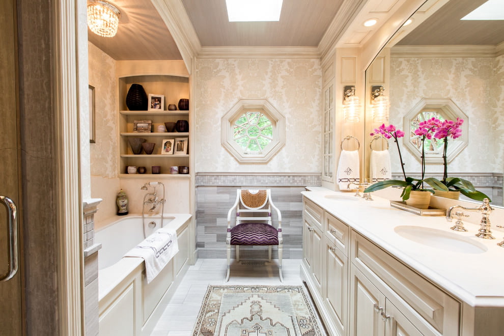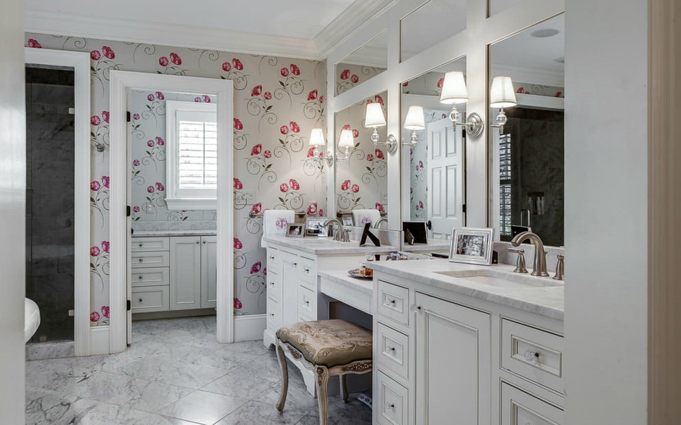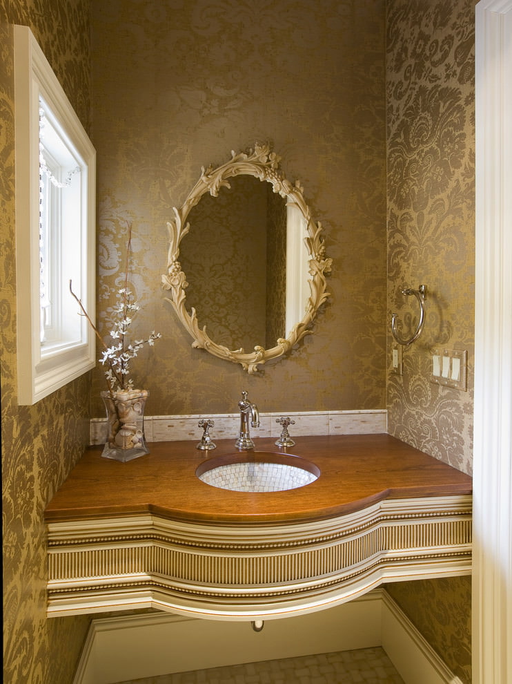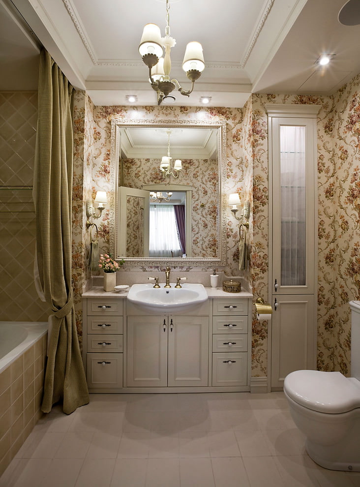 On the picture the bathroom in a classic style is covered with wallpaper with an ornament. This design is possible with good ventilation.
