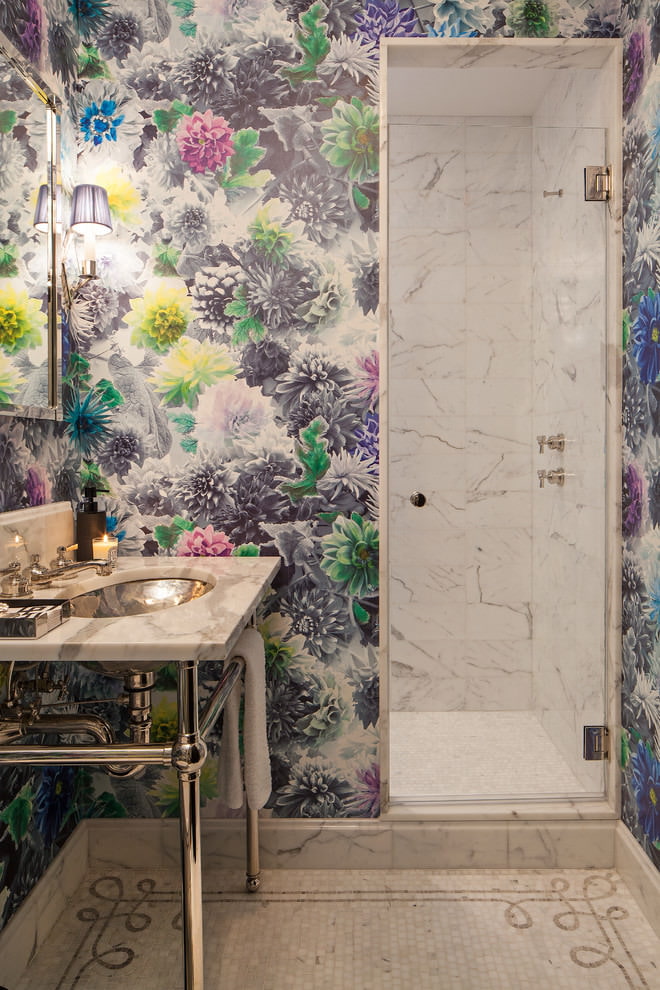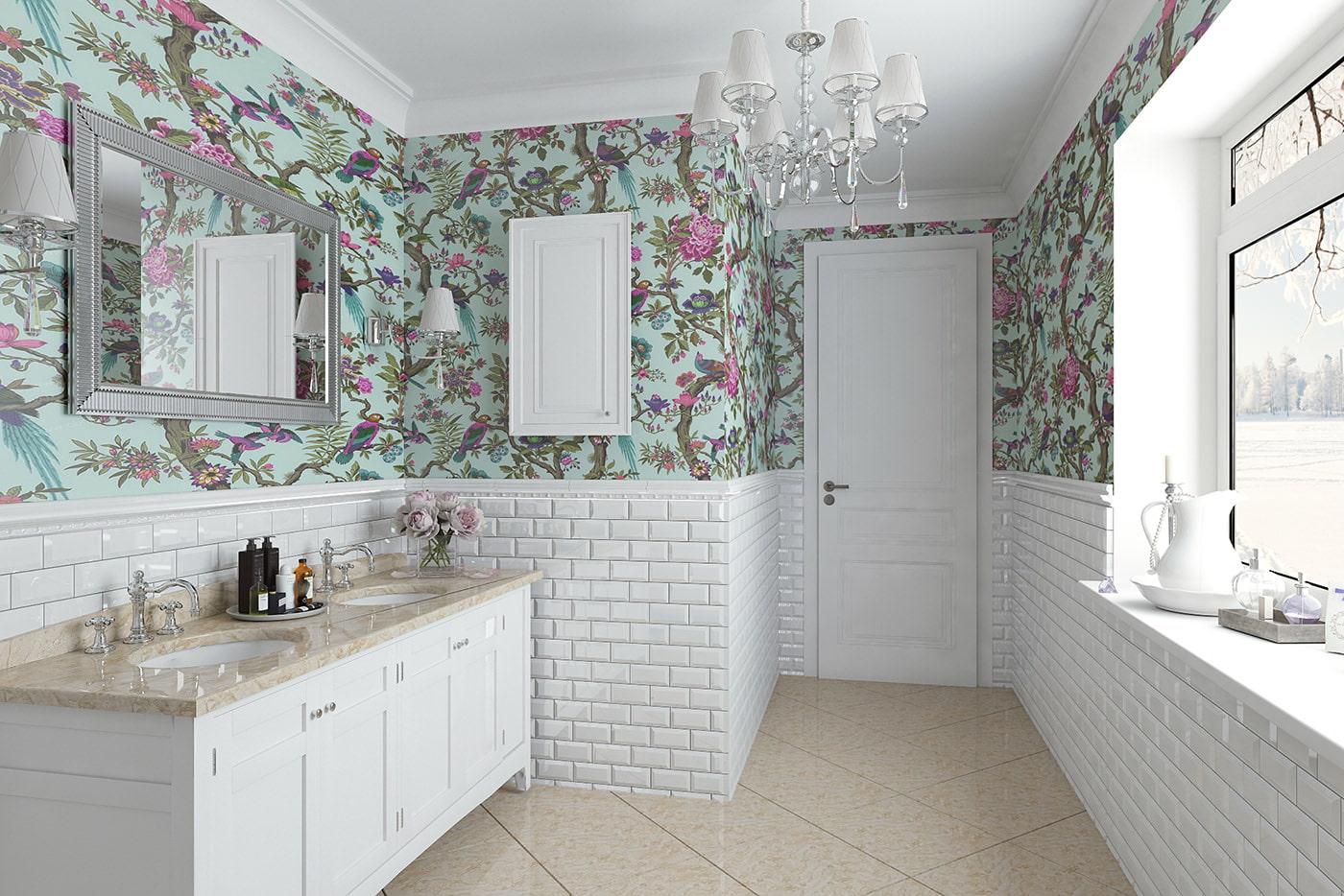 On the picture Brightly patterned pastel wallpapers combine with decorative bricks to set the mood in a white bathroom.