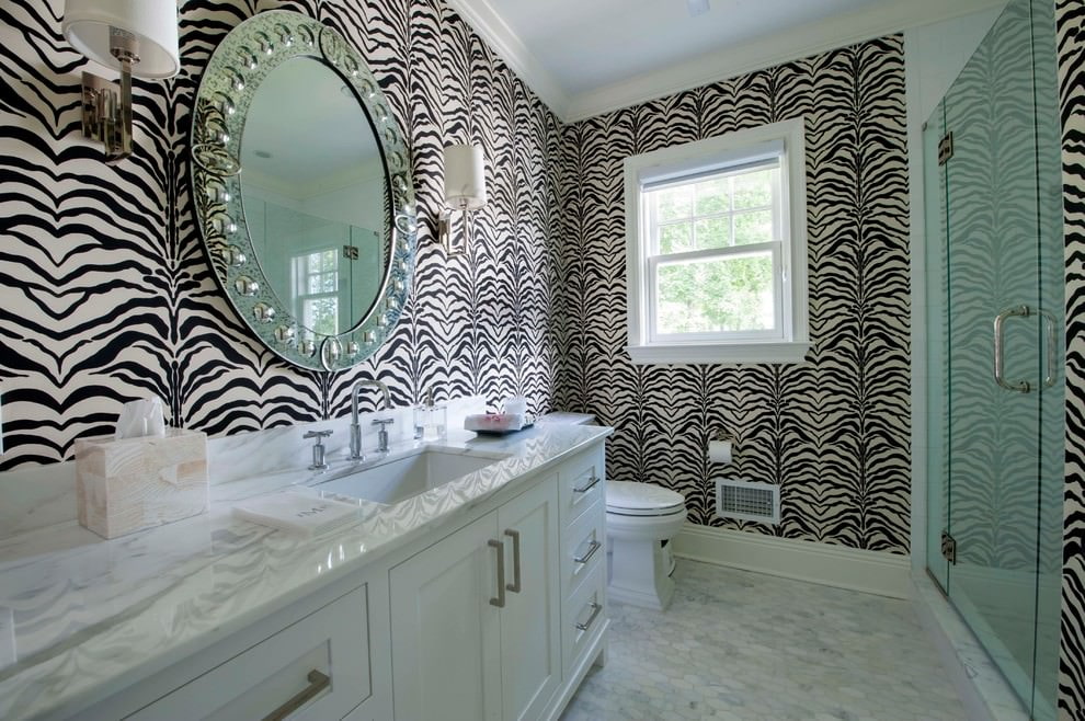 On the picture black and white design, dominated by white. Tile protects the bathroom and shower area, and realistic-sized wallpaper is applied around the perimeter.