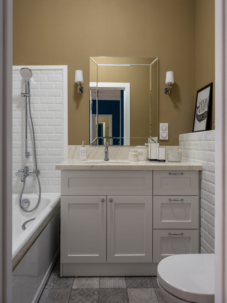 It is much easier to place furniture in a combined bathroom than in a separate bathroom and toilet. Highlight a small, narrow cabinet or display rack for textiles, soap supplies, and cleaning supplies.