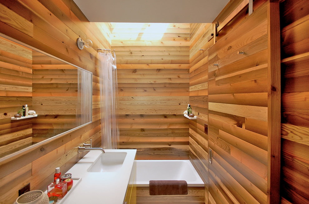 - Wireframe... Lamellas are installed on wooden or metal battens. The main advantage of the method is that there is no need to prepare walls. In addition, communications can be hidden in the frame - pipes, ventilation or wires. The disadvantages are the cost (the frame can be more expensive than the planks themselves) and a decrease in the area of the bathroom by 5-7 cm.