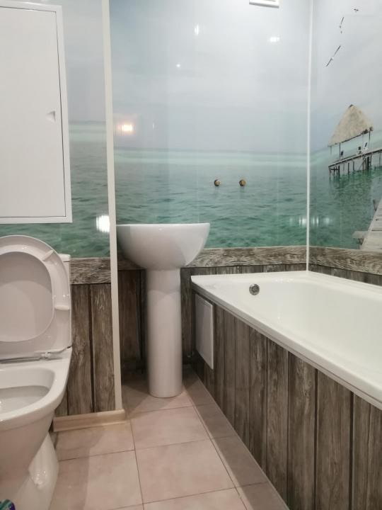 The photo shows a real example of finishing a combined bathroom with pvc panels
