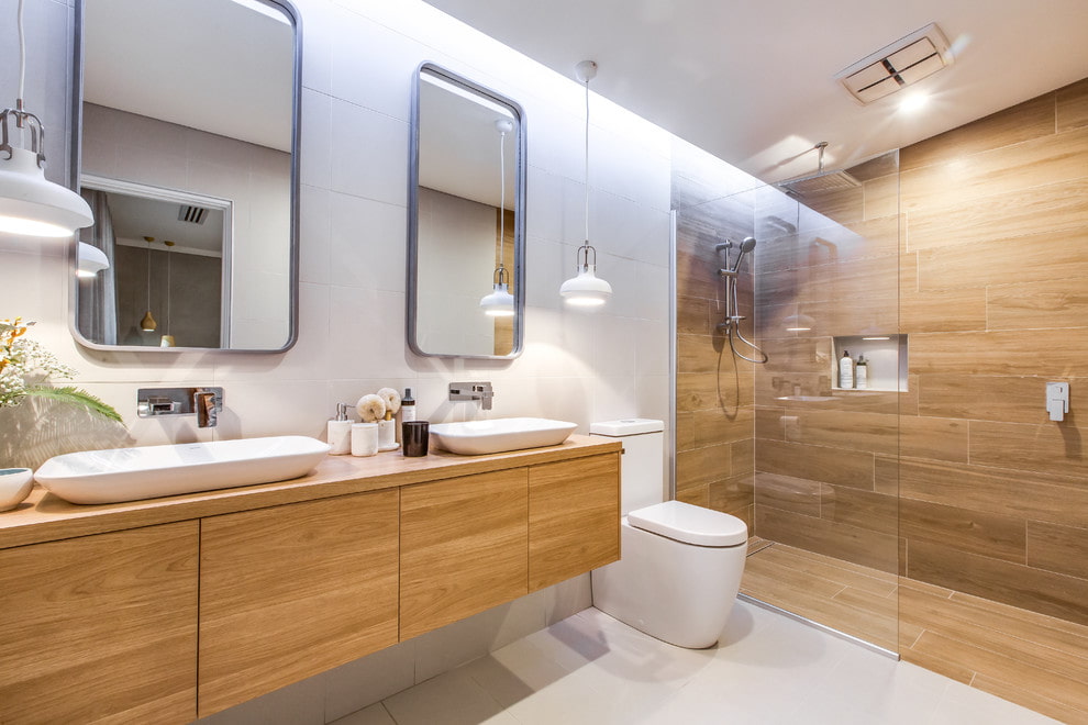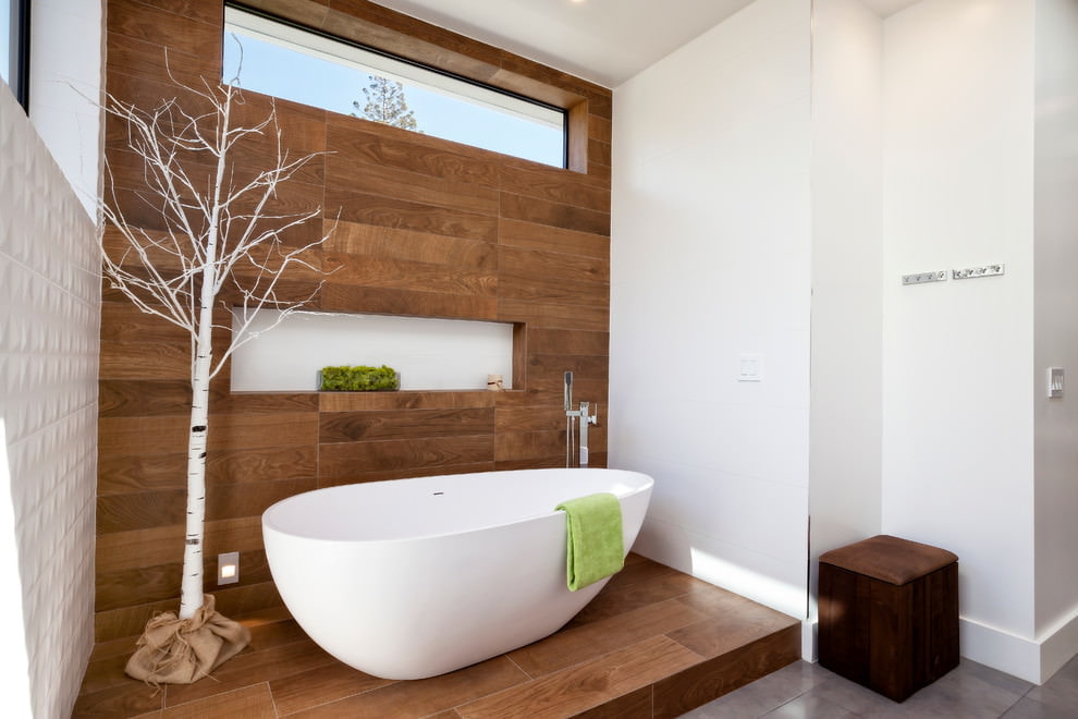 Especially popular is the wood-like tiled cladding in brown and beige tones. Also, the finish can have shades of exotic expensive wood species, for example, wenge, mahogany or rosewood, which will be more appropriate in spacious bathrooms.
