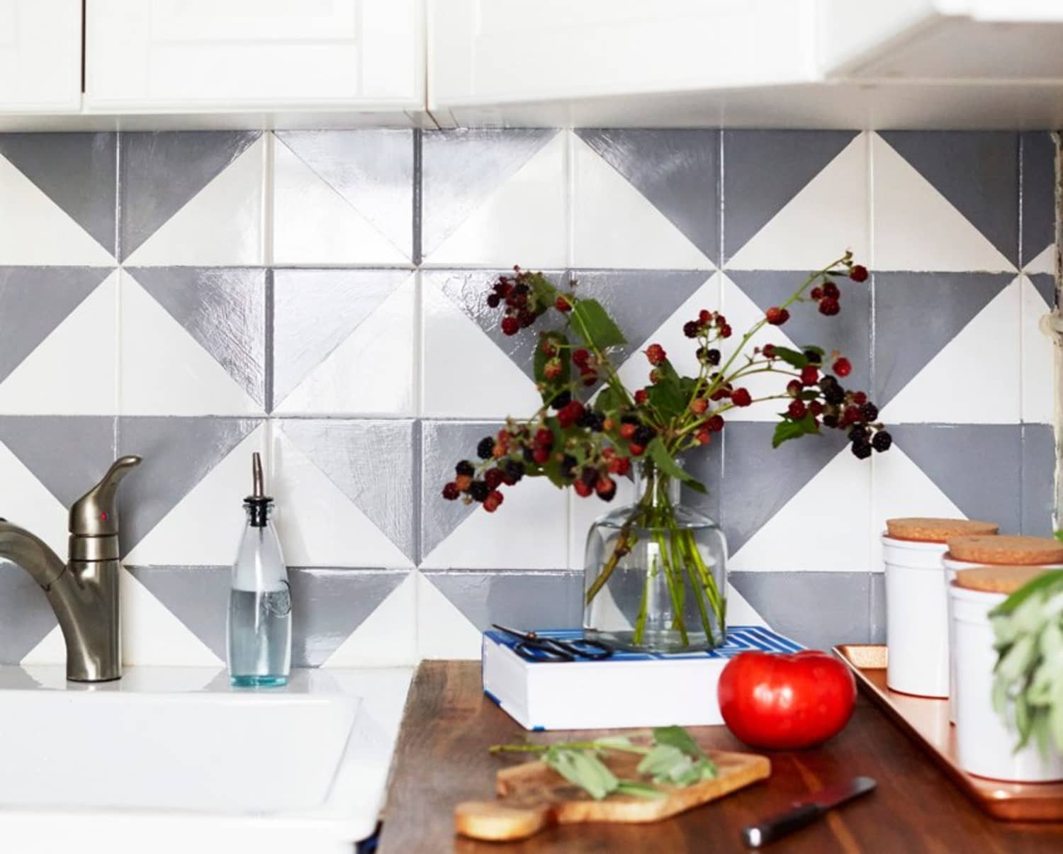 The easiest option is to cover the tiles with an even, uniform layer, but if you want to create an original design, use stencils. This idea is simple and inexpensive, and there are a great variety of patterns in stores - from colors and geometry to children's drawings.