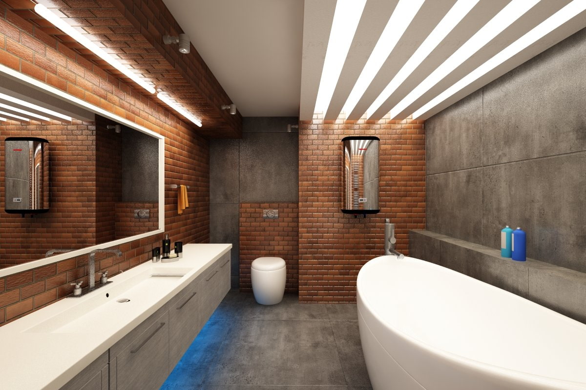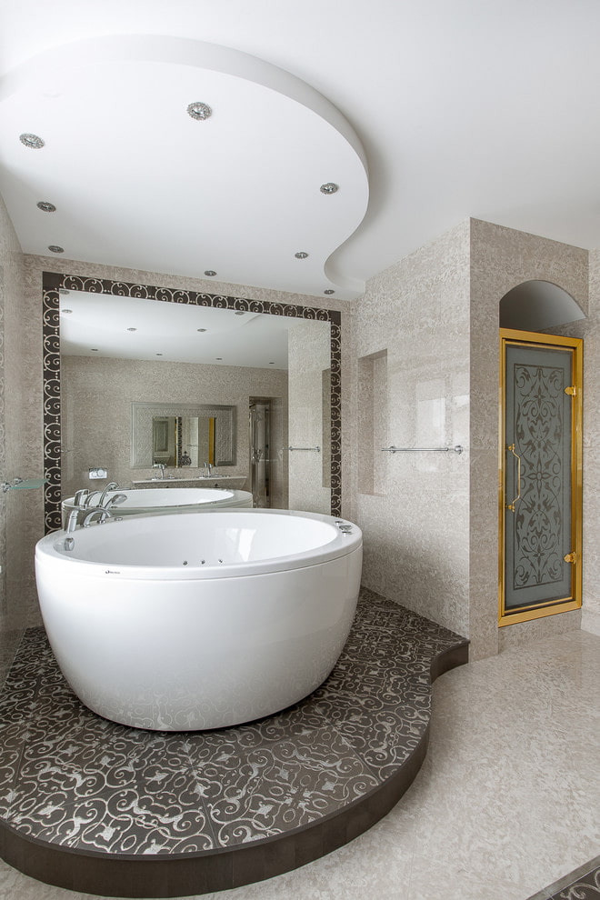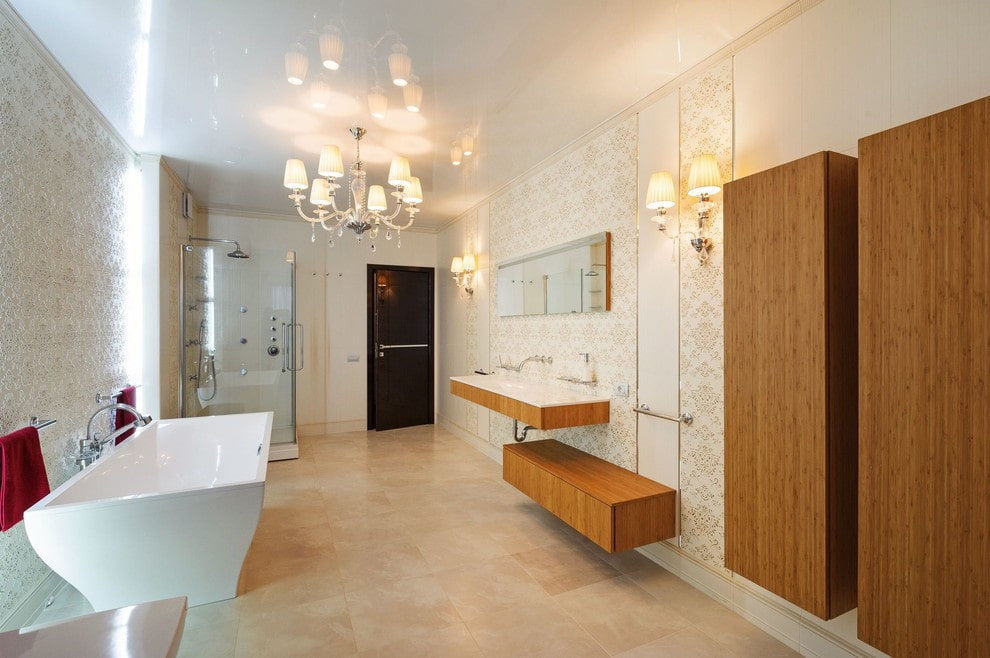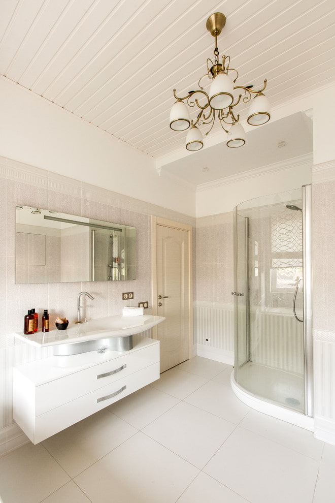 The huge possibilities of ceiling lighting allow you to create any interior effect in the room. Lamps, chandeliers, lamps, overhead shades or other various types of built-in lighting, perfectly emphasize the features of the bathroom, zoning the space and creating a certain atmosphere in it.