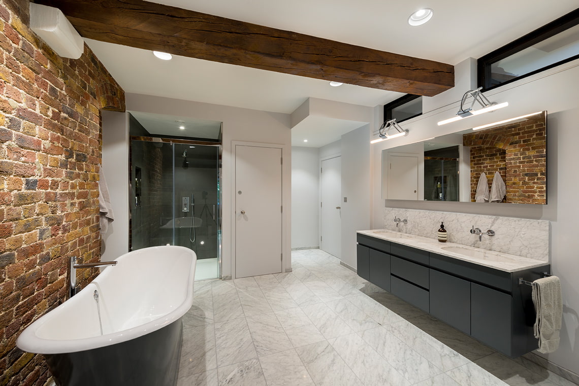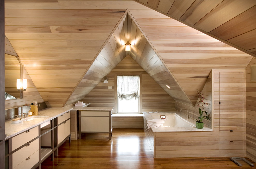 The photo shows a wooden ceiling with beams in the interior of a loft-style bathroom.