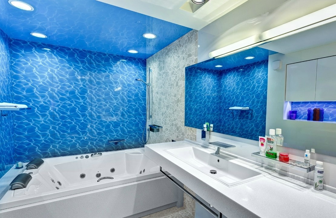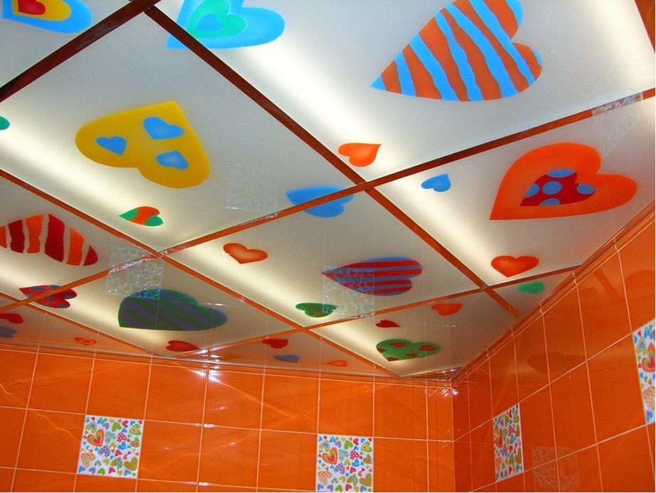Interesting color solutions for decorating the ceiling in the bathroom.