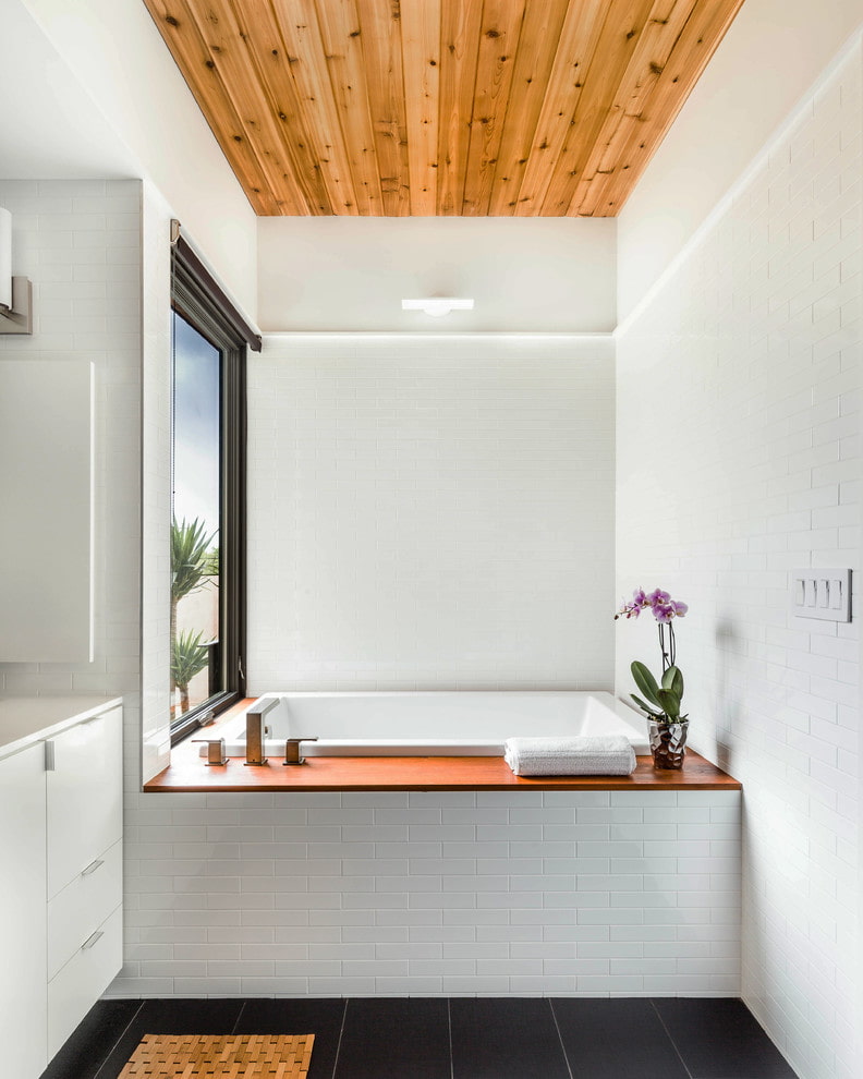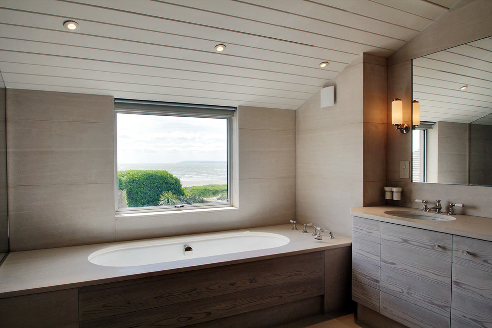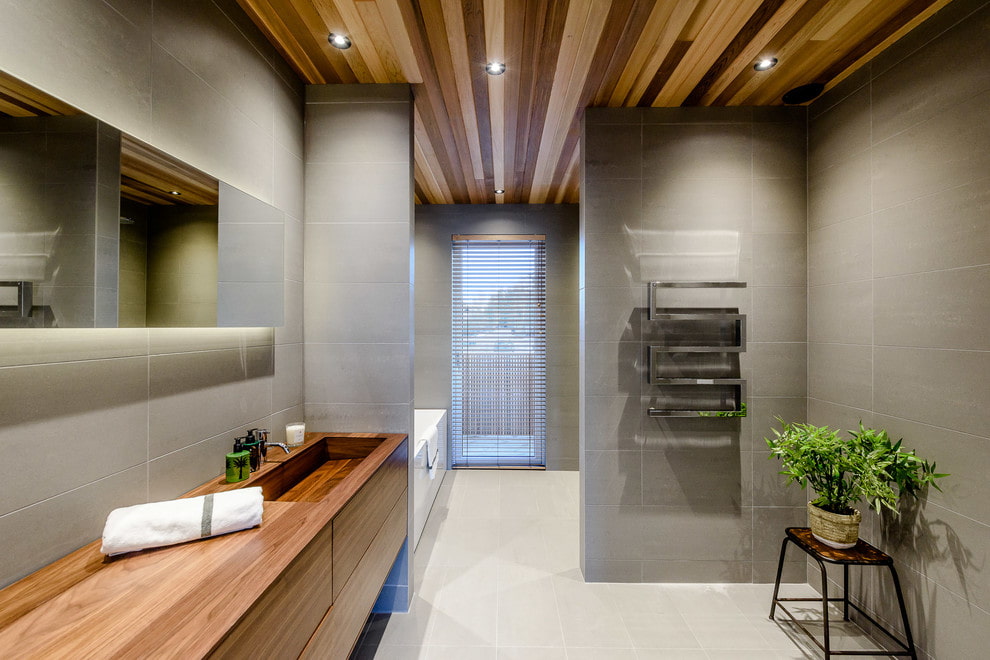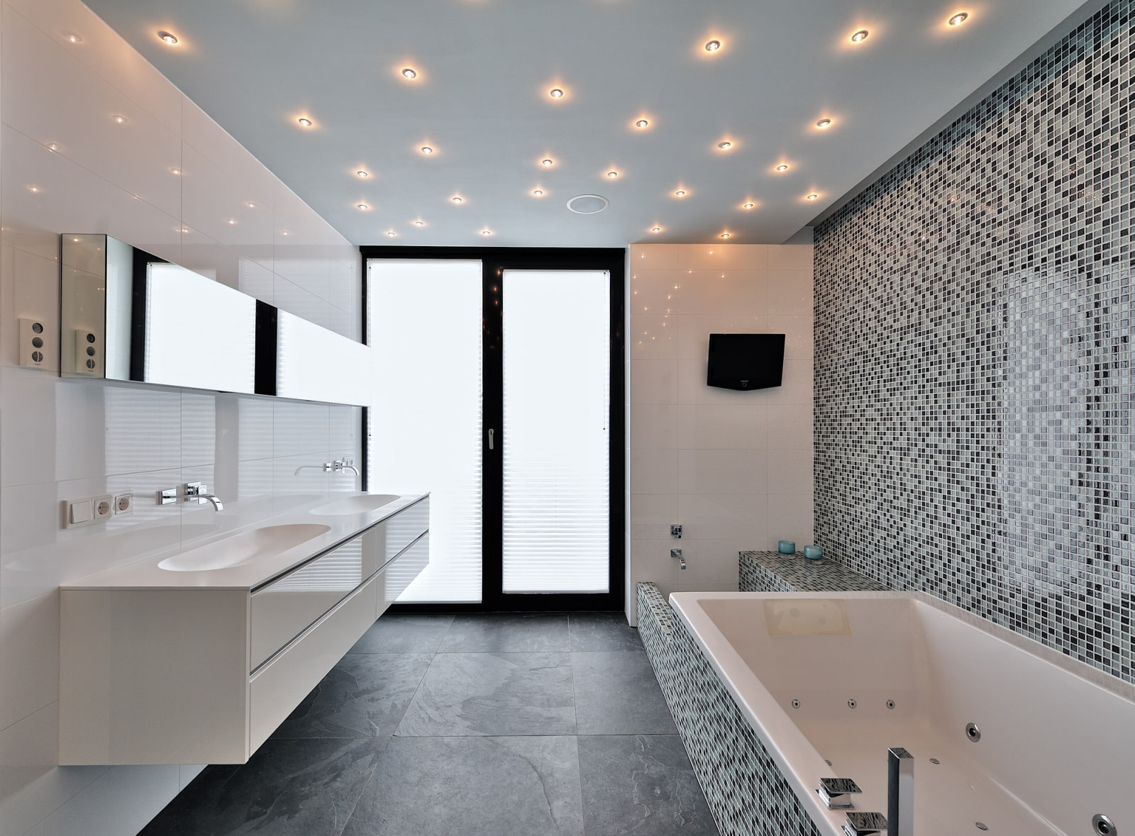Depending on the type of ceiling surface, the bathroom design takes on a more sophisticated look.