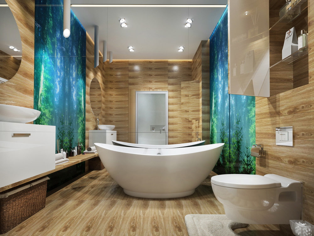 Natural wood materials from moisture-resistant rocks will perfectly fit into an environmentally friendly interior design. Mosaic, glass, plastic, metal or ceramic tiles are also used for decoration.