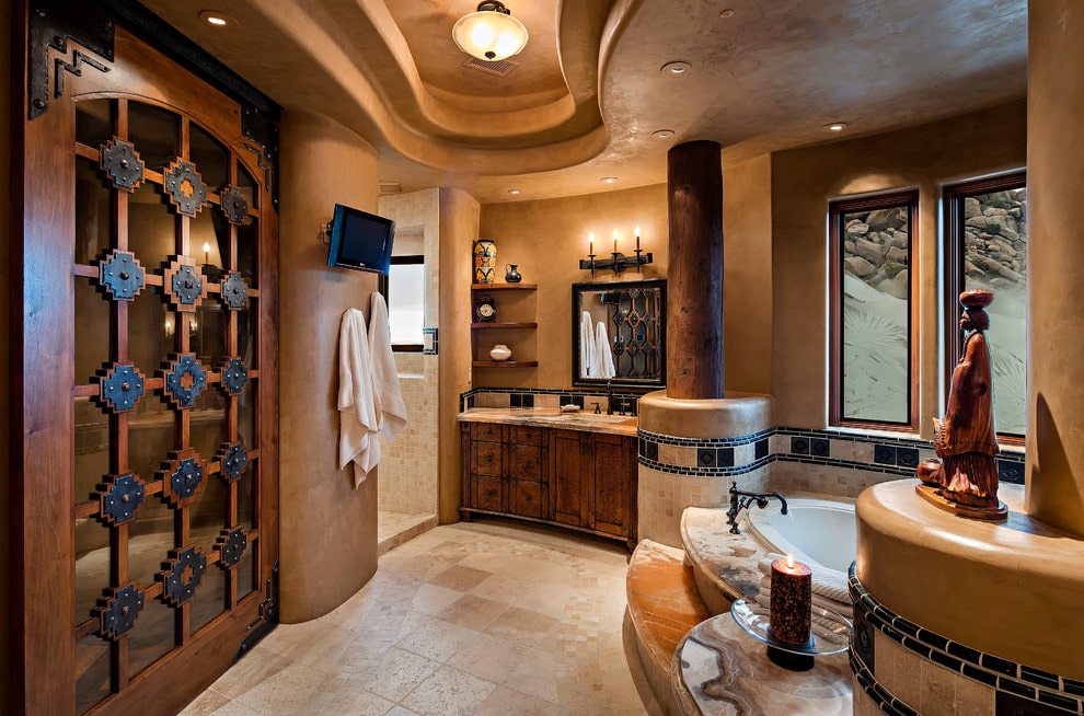 In the photo there is a curly ceiling structure in the shape of a circle located above the bathroom.
