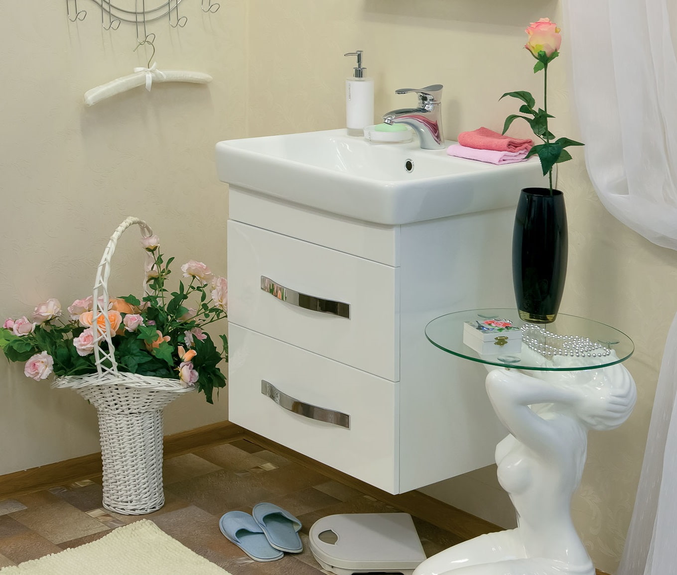 In a cramped bathroom you need to squeeze the benefit out of every centimeter of the area, so it is reasonable to choose sinks with cabinets for storing things, place a washing machine under them or a laundry basket.