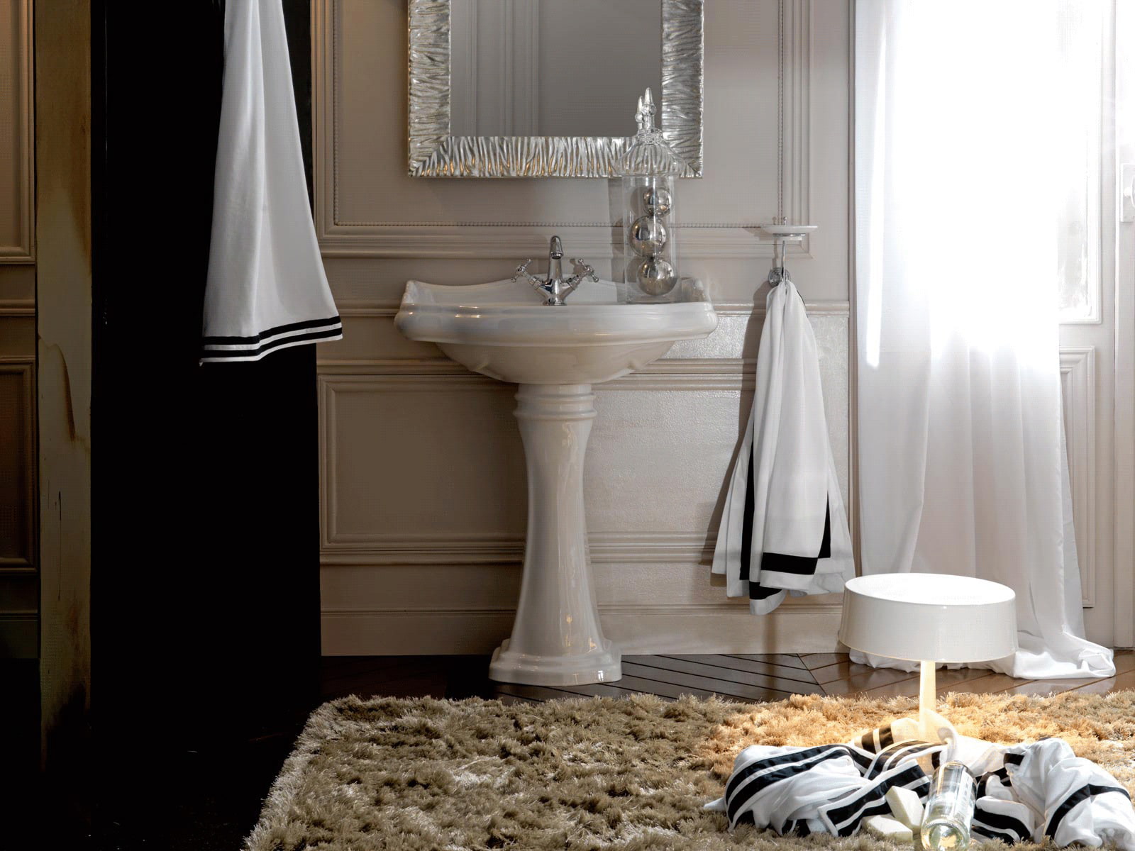 Corner sinks not necessarily mounted, floor models with pedestals are available for the rational use of free space.