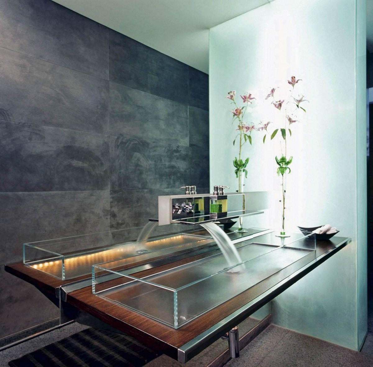 Strained glass from 15 mm thick - a fashionable material for the manufacture of sinks in the bathroom. But if the bowl is transparent, it will have to be washed literally every day. Mineral stains are also clearly visible on matte and colored glass washbasins.