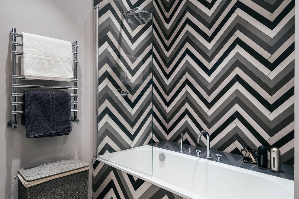 For wall decor, mosaics and a wide variety of tile finishes are often used in large, standard size, square or rectangular shapes. When designing, first of all, the dimensions of the bathroom are taken into account, for example, in a small room, it would be better to use finishing in light shades with masonry in the form of vertical stripes.