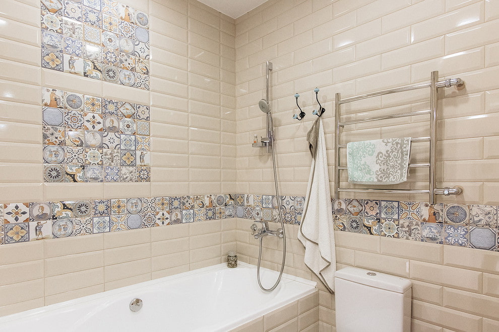 In the photo, a hog tile is beige with patchwork inserts on the walls in the bathroom interior.