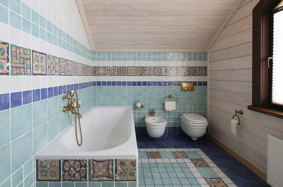 Thanks to the diagonal installation, you can not only decorate the surface, but also hide its minor defects and visually expand the boundaries of the bathroom. For this method, square tile products are most often used, with a monochromatic or patterned design.The only negative is that after the cladding, a lot of excess material remains.