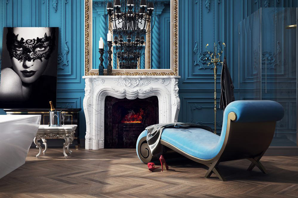 The main decorative element of a luxury bathroom is a fireplace. Since the house is old, there was already a fireplace here; all that remained was to find a suitable marble portal. The candlesticks decorating the mantelpiece are the products of modern craftsmen, but their outlines are harmoniously combined with the baroque lines of the fireplace and walls.