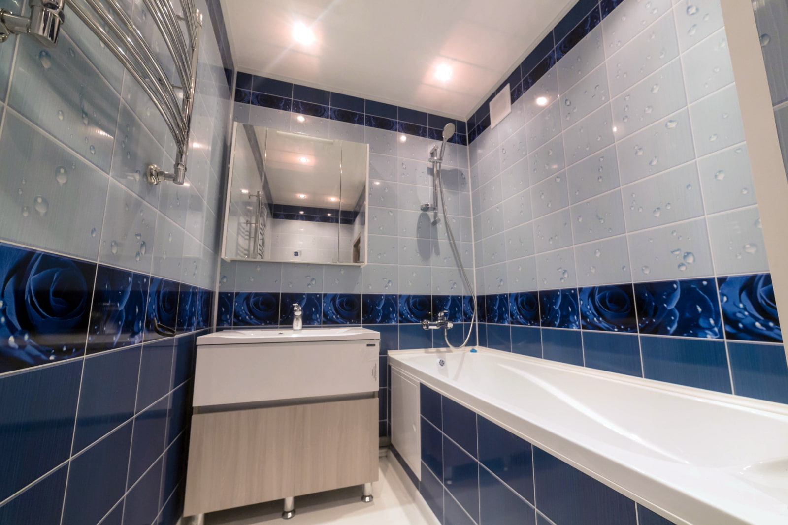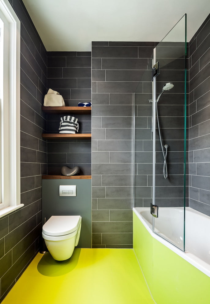 This is especially true if you want to save money on repairs: the shower area should be tiled tiles, creating a bright accent, and paint the remaining areas. The material gives a wide field for creativity, in addition, it allows you to decorate a bathroom in any shade and change its appearance in a couple of days.