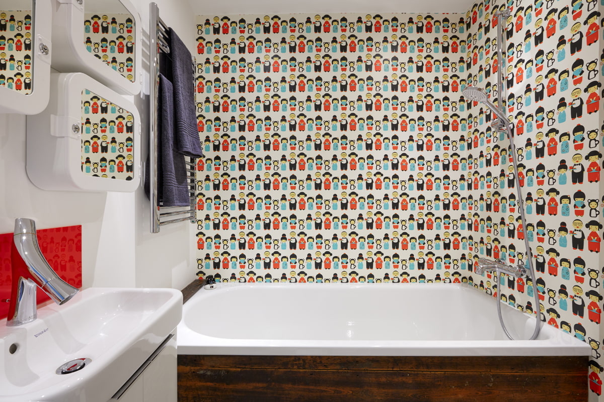 When choosing wallpaper, you should give preference to canvases on which markings are indicated in the form of three waves and a brush. The optimal solution is vinyl, which masks the imperfections of the walls and is easy to clean. By decorating your bathroom with wallpaper, you will save money and time: unlike tiles, they are cheaper, but at sticking it takes no more than two days.