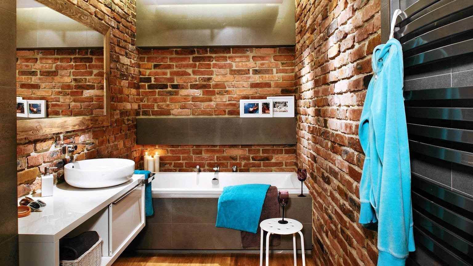 Gray concrete acts as a great backdrop for any bright accessories and snow-white sanitary ware. Such surfaces must be treated with an antiseptic impregnation, and the brick must be covered with a moisture-resistant varnish.