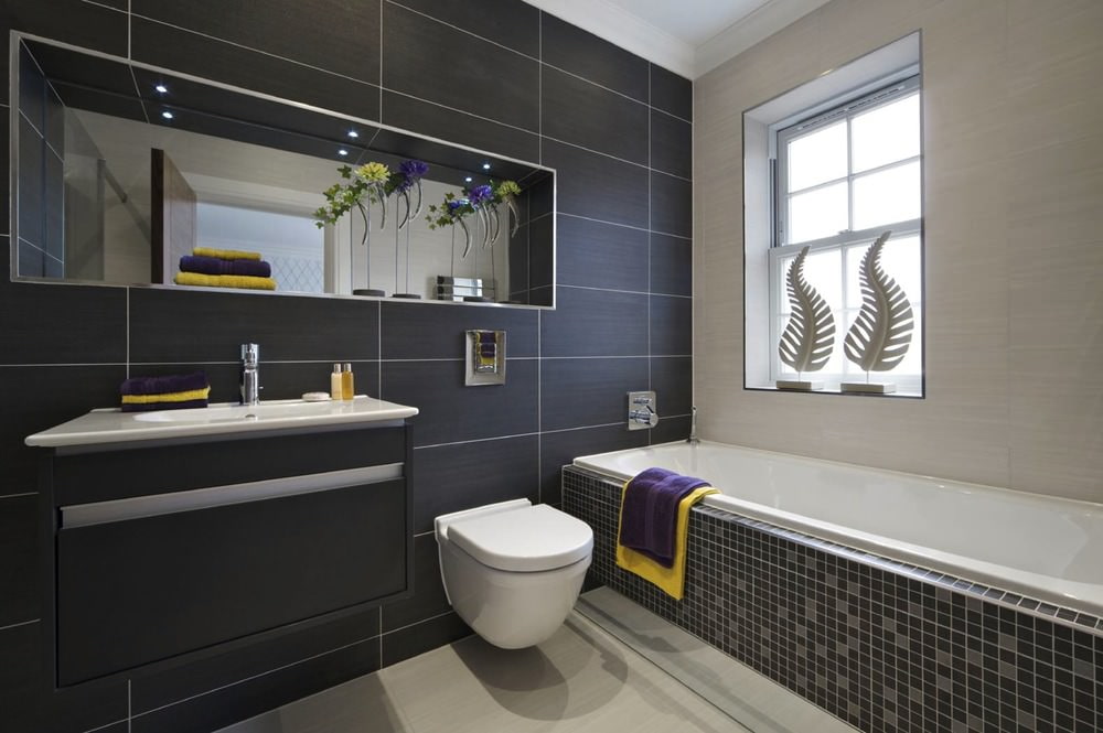 Gray tiles in the bathroom go well with shades of beige - peach, apricot, as well as light green, pink and lavender. Classic combination with black and white also cannot be neglected, it is always up-to-date and gives elegance. Beige tones will bring warmth to the interior, green and blue - cool.