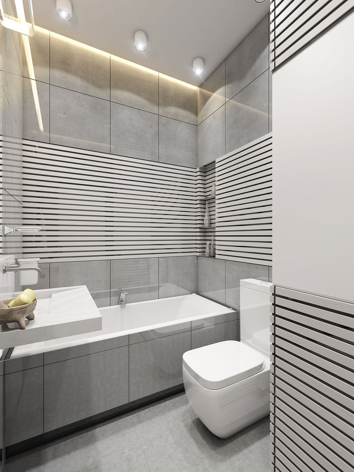 Using gray with a cream or beige tint for decoration, you can get a light and cozy interior. White plumbing, glass and mirror elements and a well-thought-out lighting scheme can add brightness and radiance to the room. It is also better to use furniture in light colors.