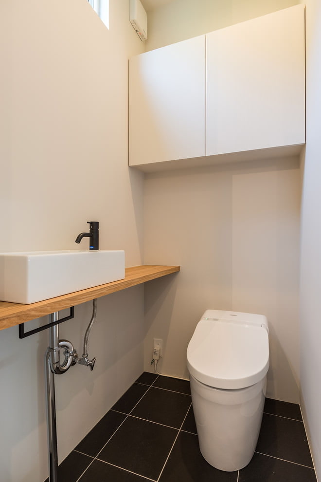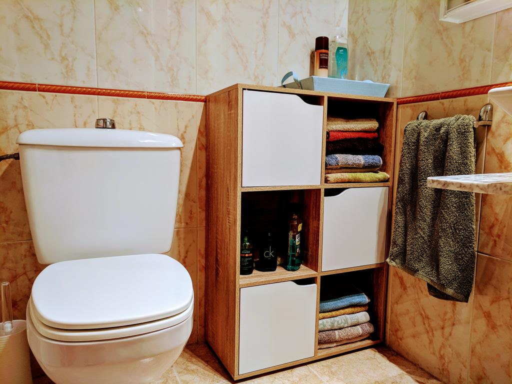 Convenient cabinet behind the toilet, provides an excellent storage system for toilet paper, towels, air freshener and other little things.