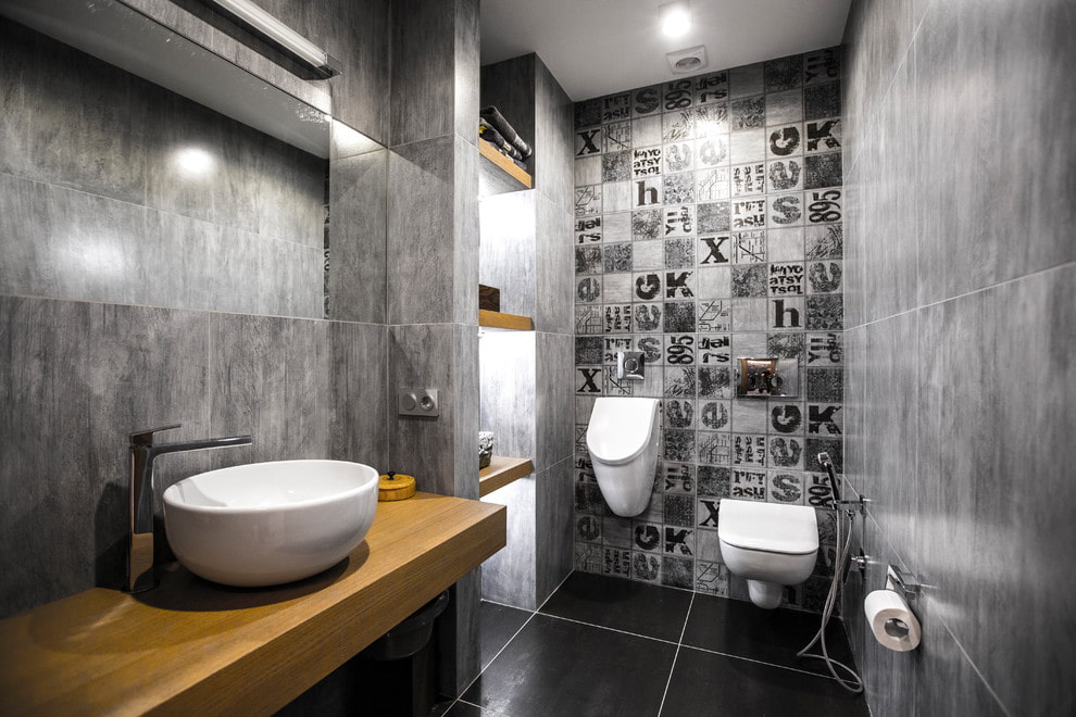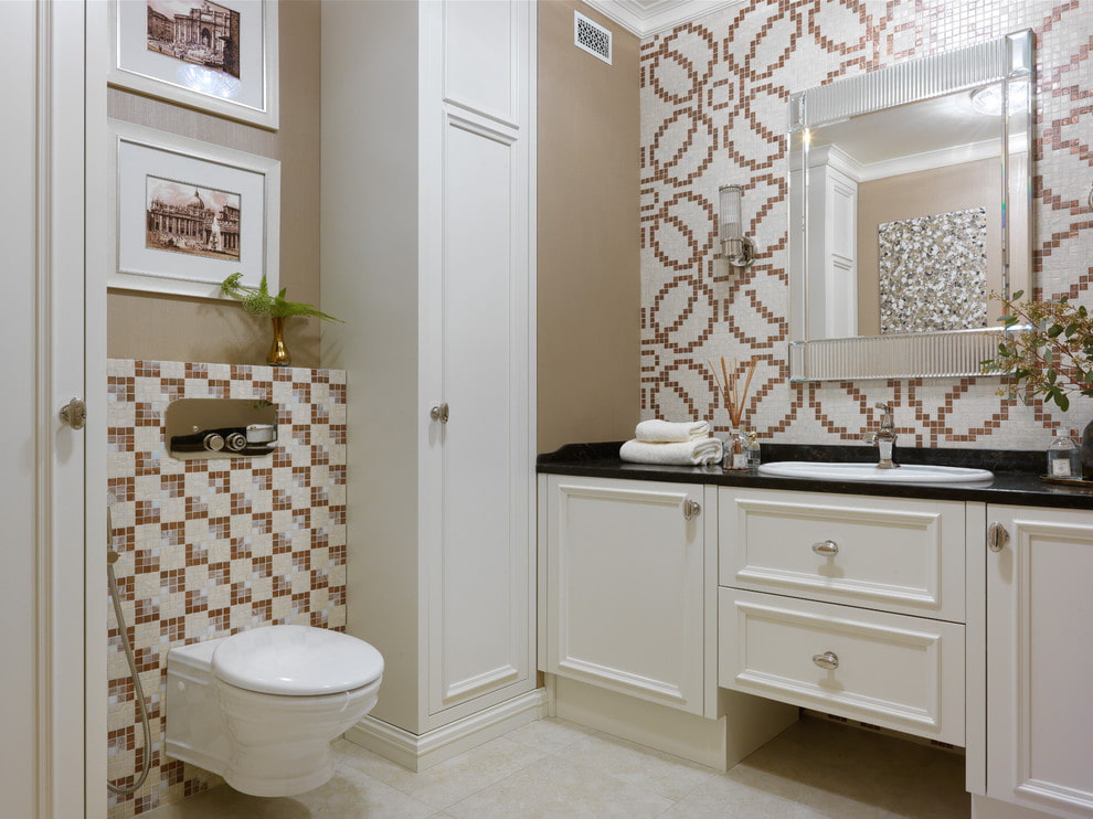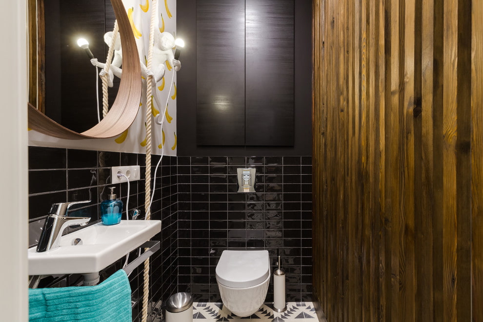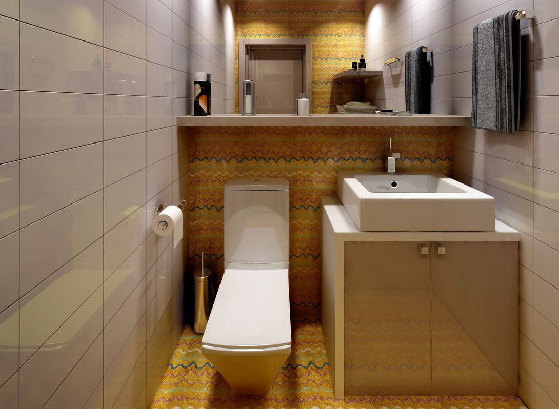 It is considered the most suitable option for small washrooms, which can be located in any corner of the room. Two corner shelves installed on both sides of the toilet will look very organic.