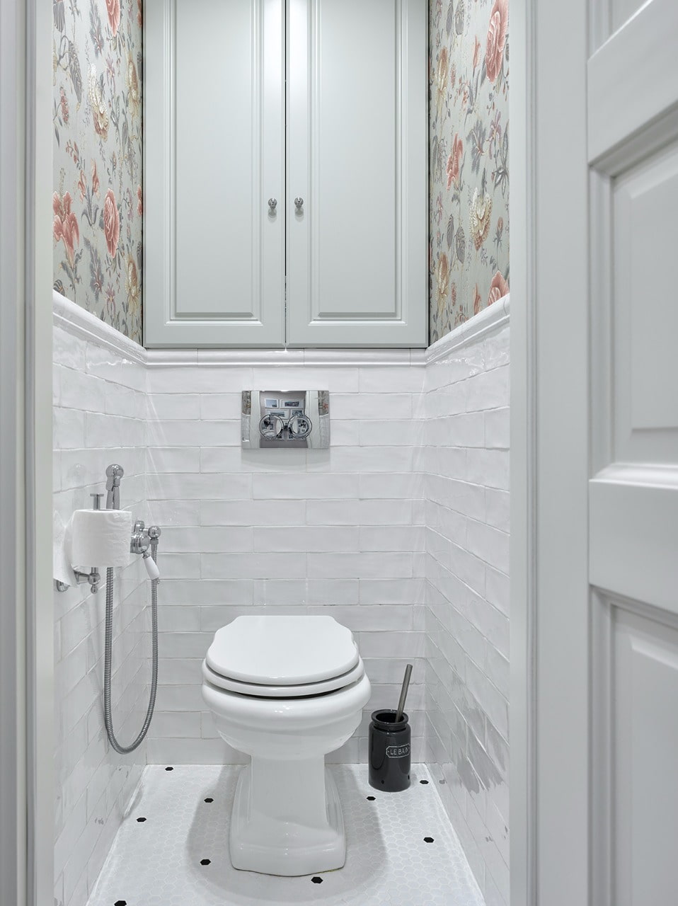 A small toilet room is equipped with narrow shelves that take up space above the toilet bowl, or a side wall or mini-models, with open or closed shelves that look very harmonious and neat.
