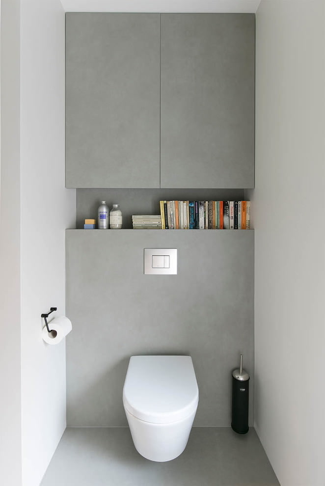 In the photo on the left, there is a narrow wall cabinet above the cistern in the interior of a modern toilet.