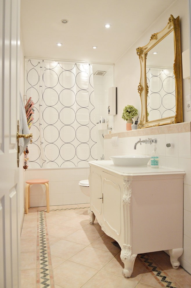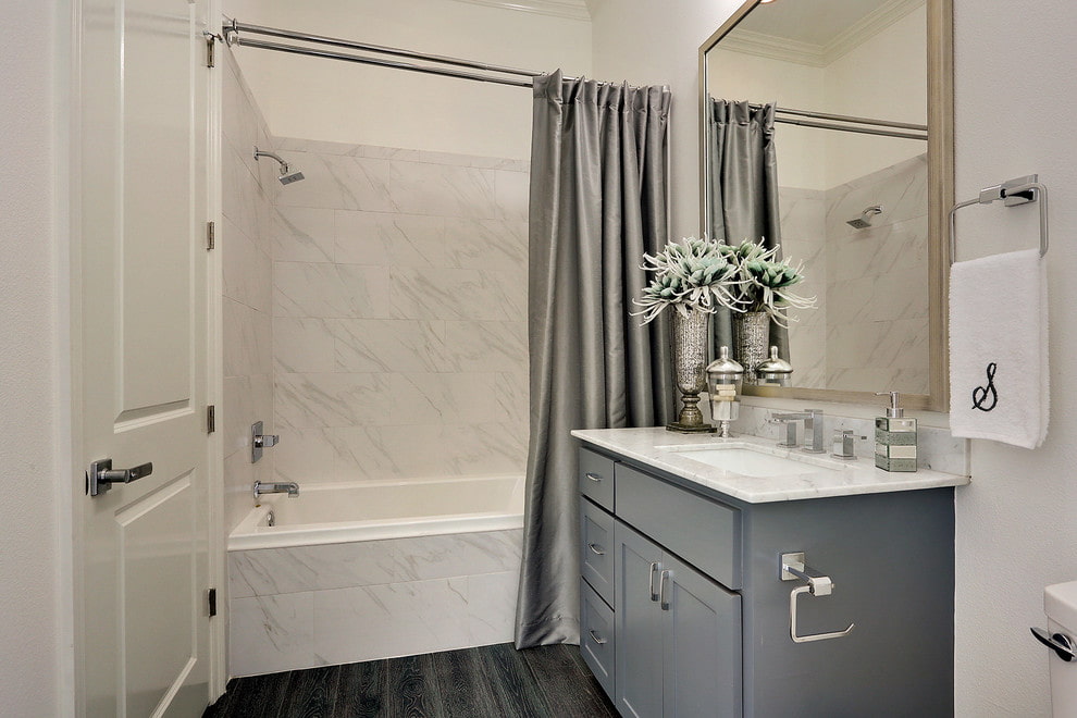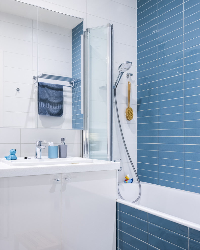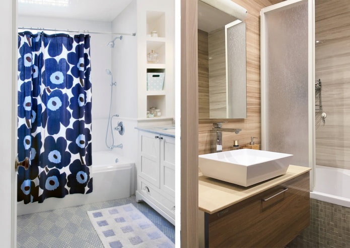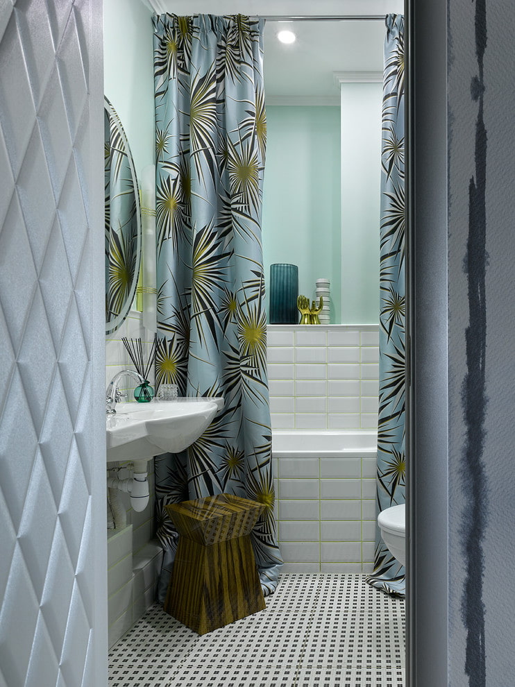 Bathroom curtains are made from inexpensive PVC or water-repellent polyester. Unlike glass structures, the curtain can have any pattern, color and degree of transparency. This makes it possible to add variety to the interior design: if the look of the bathroom gets bored, it will not be difficult to change the curtain.