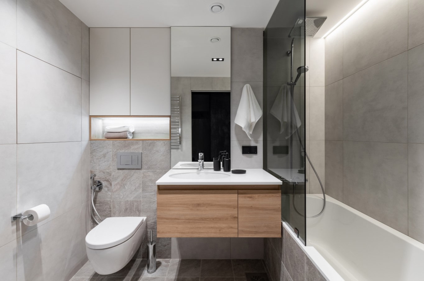 Beige is diluted with brown, light gray with graphite. By focusing on one color, the result is a bathroom design in modern style... But do not forget about the proportions: light - 70%, medium - 20%, dark - 10%.