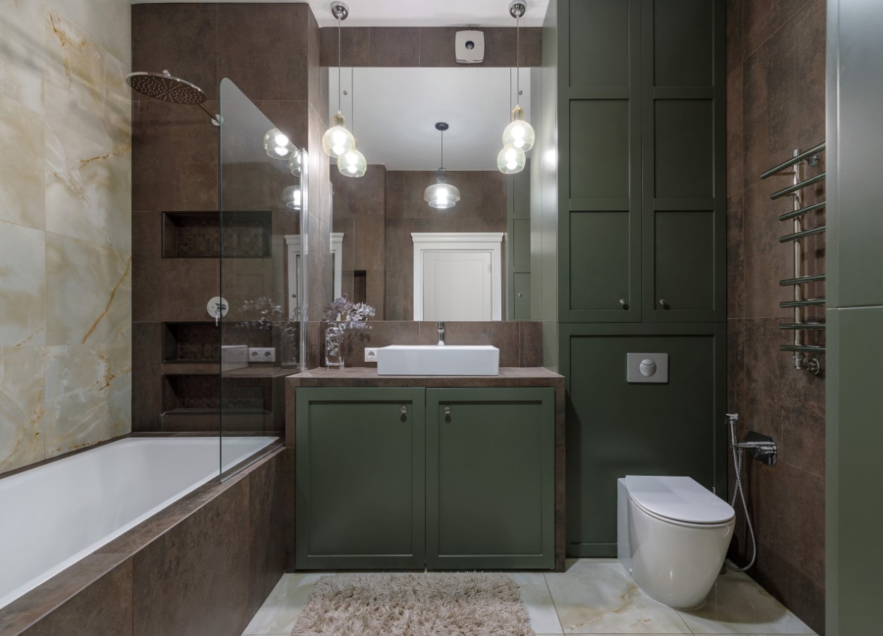 In the design of bathrooms, bright details will not be superfluous: for example, yellow accents in a black room or green in brown. It is the expressive tones that set the dynamics for the interior.