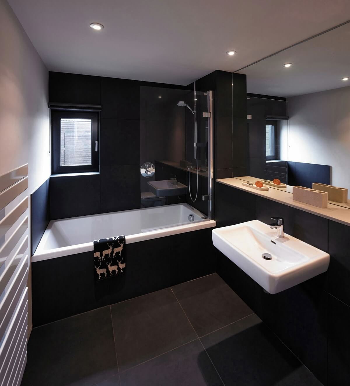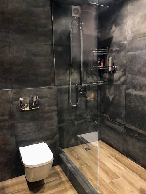Renovation of a bathroom in dark colors is not much different from any other. Finishing materials should be durable, waterproof, preferably antifungal.