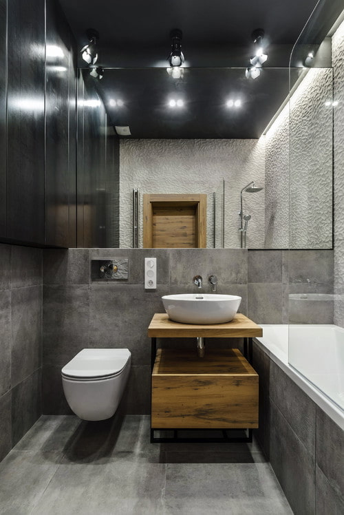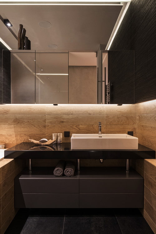 The fact that a dark color visually diminishes the room does not mean that a bathroom in dark colors must necessarily be large. Walls of gray, brown, black colors are also acceptable in small bathrooms - but designers advise choosing glossy textures and combining them with wood, tiles of a more bleached shade, light matte surfaces.