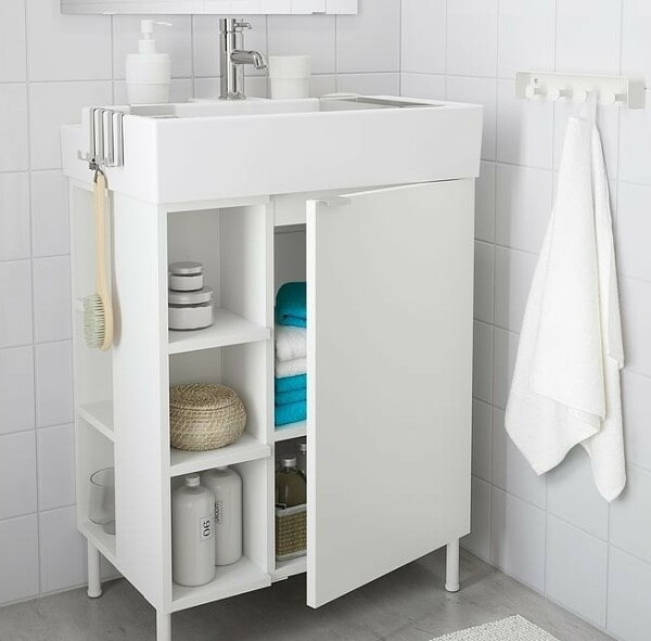 Place towel hooks on the side of the cabinet or hang a vertical organizer. This useful accessory will always come in handy for storing the little things you need.