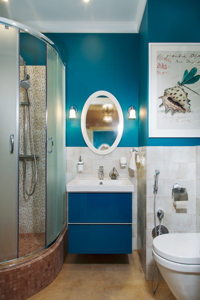 The option is suitable for those who want to add decorative details to a laconic bathroom, but are not afraid to overload the room. Also, this technique will help to hide single tile defects: optimal for a rented apartment, in the improvement of which you do not want to invest much money.
