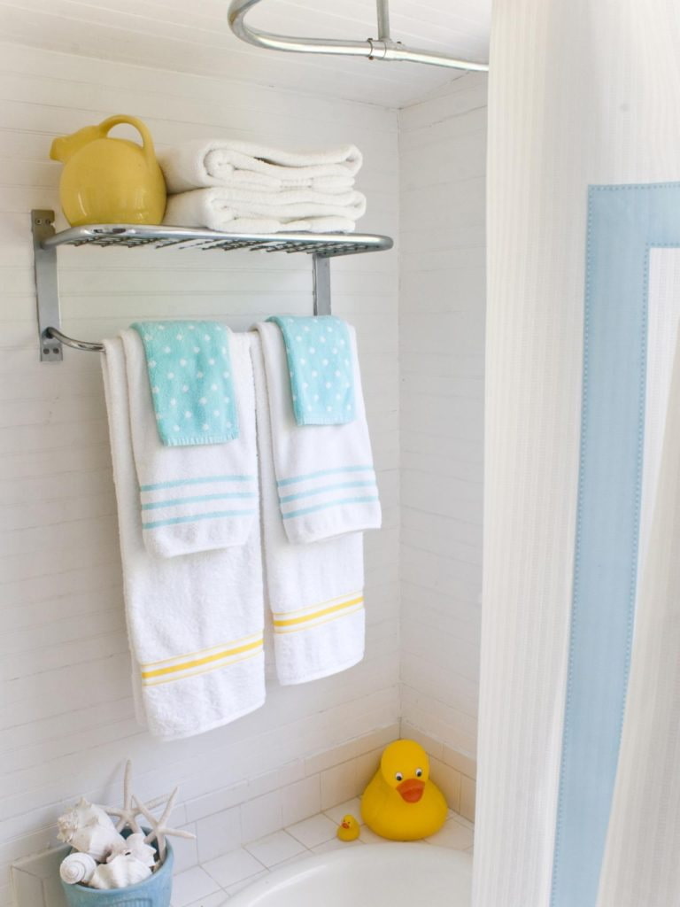 The bathroom looks much more attractive, where towels are hung on crossbars, and not on hooks, or rolled up and laid out on shelves.
