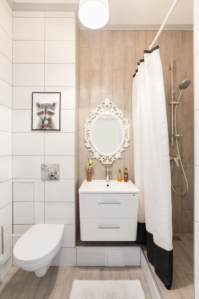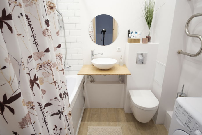 But if you want it to be as inconspicuous as possible, get a solid color product in the color of the walls. In a laconic bathroom, you can use a curtain with geometric patterns.