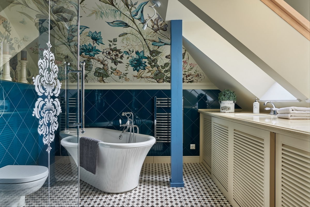 An excellent solution is decorative plaster and wallpaper: the choice of shades in the modern construction market allows you to bring any idea to life. Fans of the Victorian style (one of the classics) decorate the bathroom with wood paneling, placing them on the lower part of the wall.