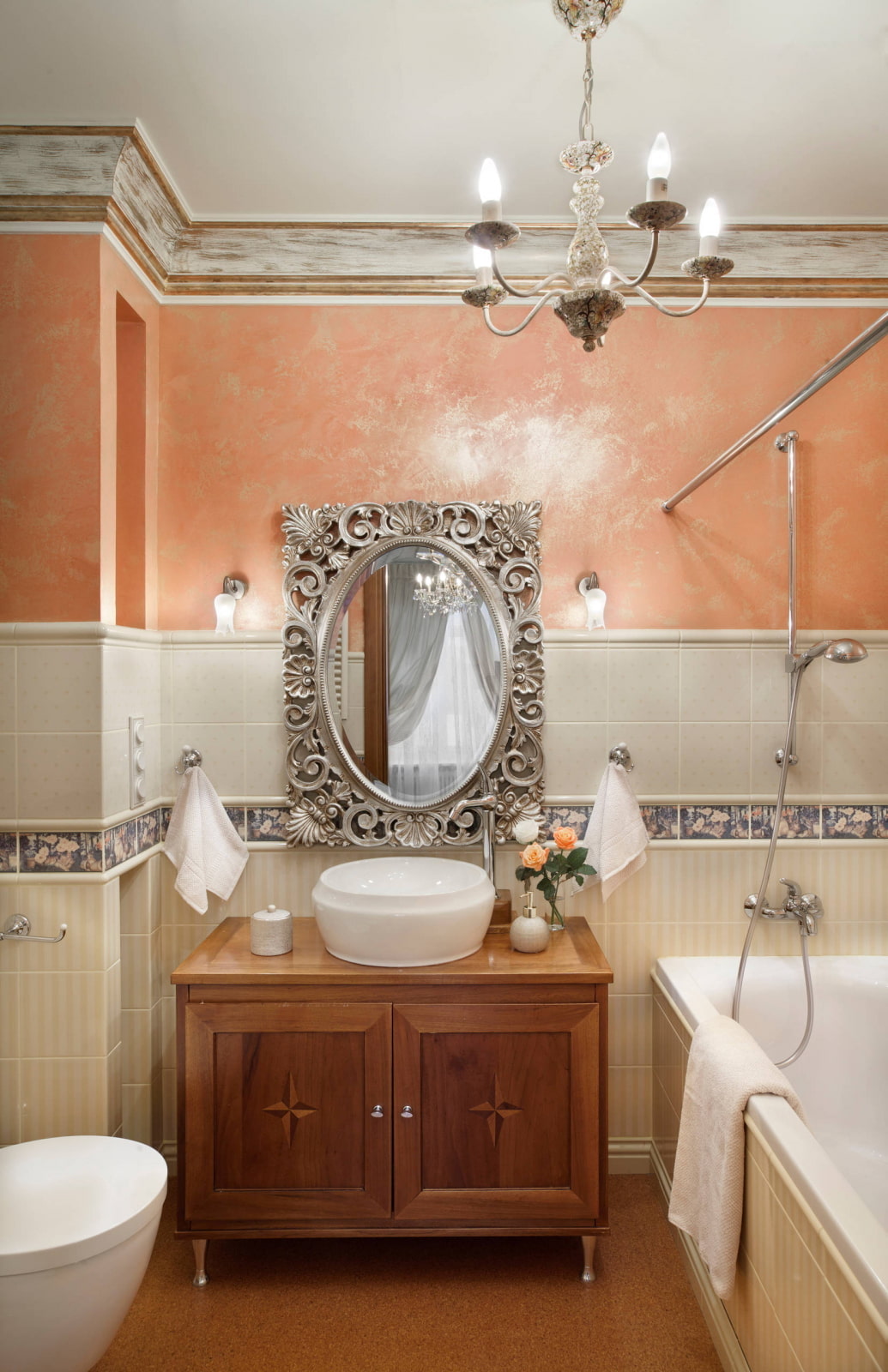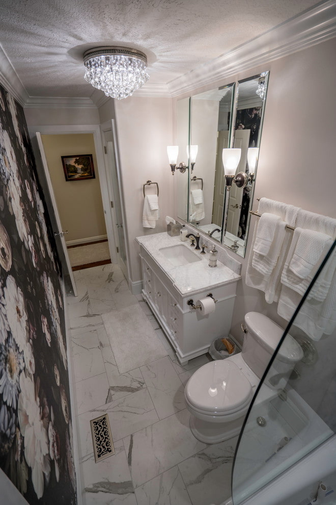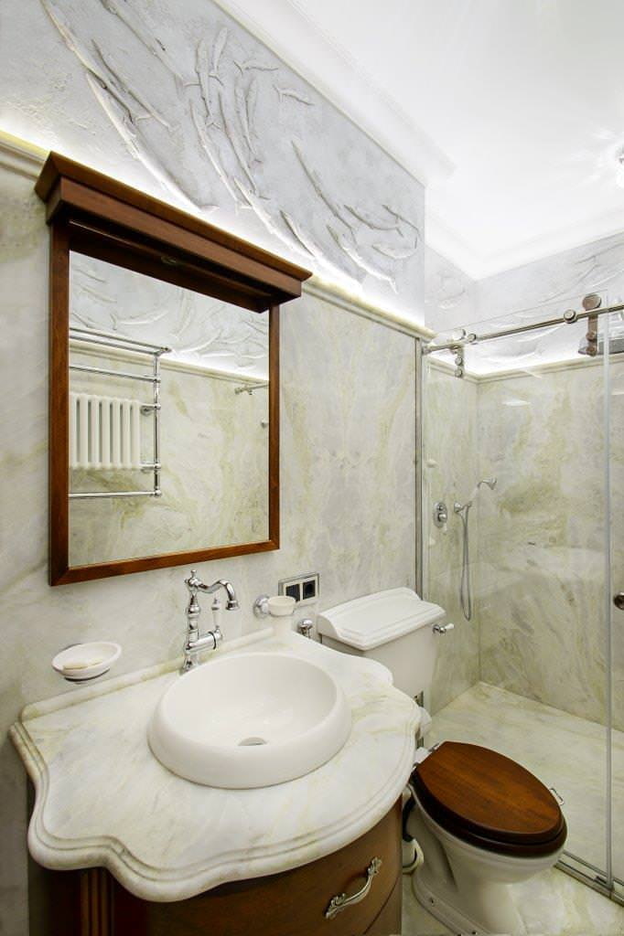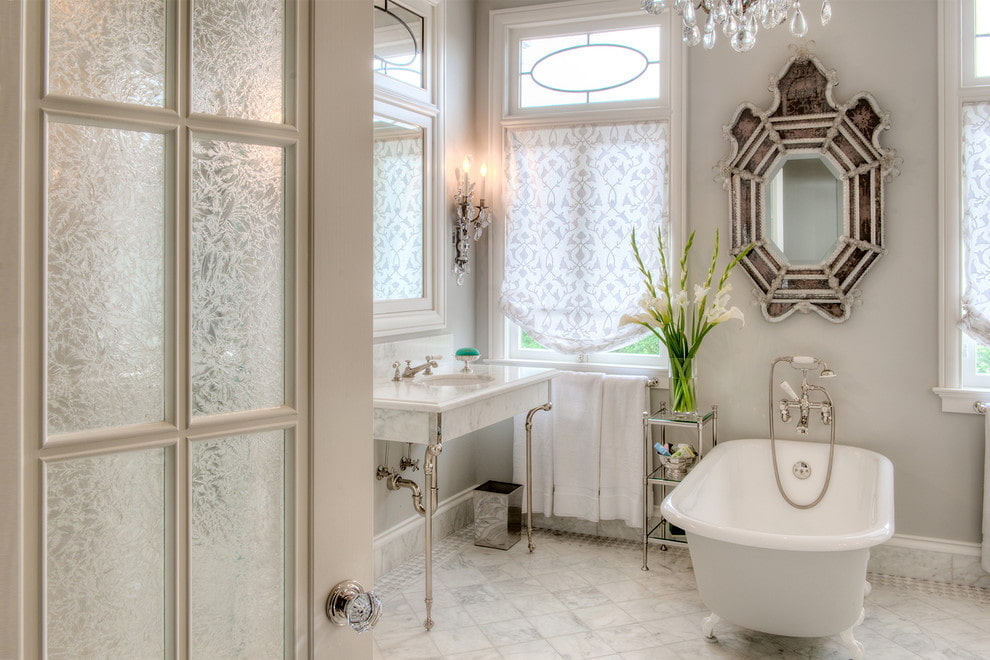 Lighting plays an important role in creating classicism in the bathroom. As the main light source, you can use a small but picturesque crystal or glass chandelier that is not afraid of moisture. Multi-tiered luminaires are only suitable for high ceilings. Spotlights are usually installed in the shower area.