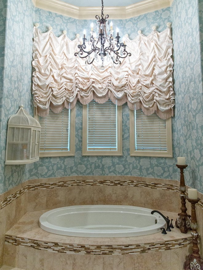 To recreate the classics in the bathroom, you should not neglect the little things: even a poorly chosen shower curtain can create dissonance in the appearance of the entire room. The product must be made of high-quality dense material, and patterns and patterns may be present in the decor. A curtain decorated with a pick-up looks great. Textiles (rugs, towels, window curtains), like any accessories in a classic style, should not stand out from the overall environment.