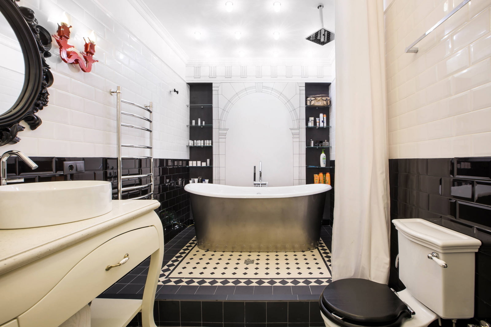 The photo shows a stylish bath in a black and white interior with golden splashes.