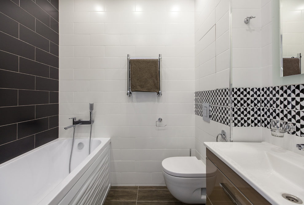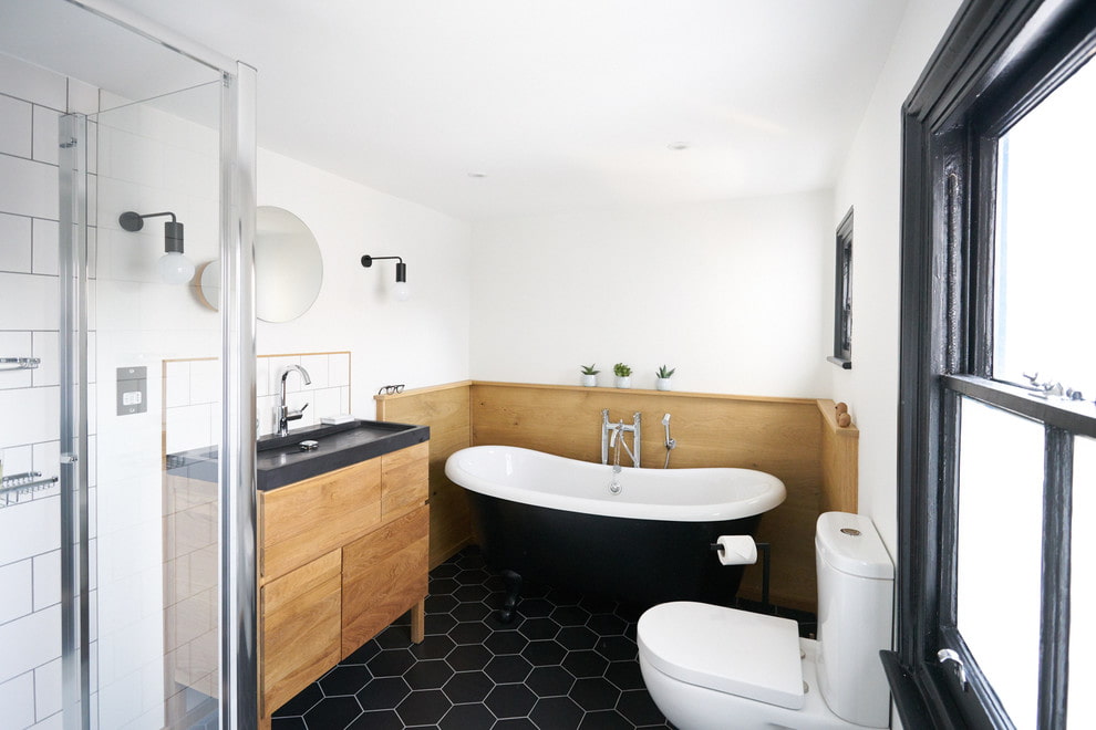 The photo shows a combined bathroom in a Scandinavian style with trim in black and white shades.