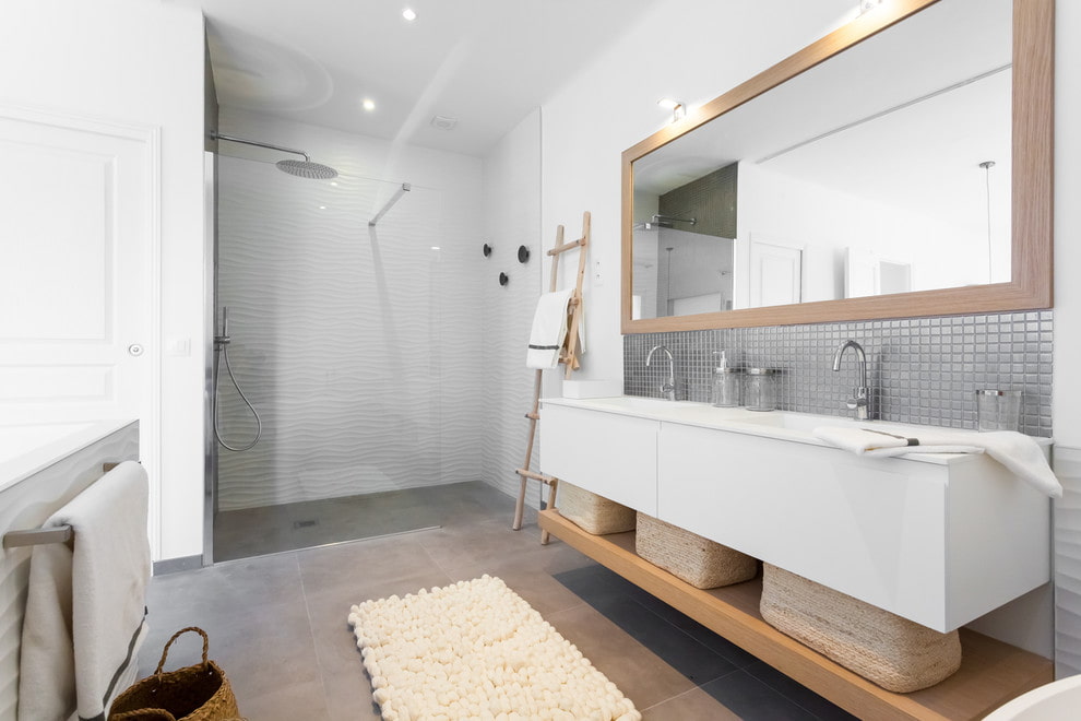 Wood is often chosen or replaced with ceramics for finishing various bathroom surfaces in a natural Scandinavian style. Floor covering in the form of wood or stone tiles is the most practical option. Partitions made of impact-resistant glass with good light transmission properties and visual airiness are used for zoning.