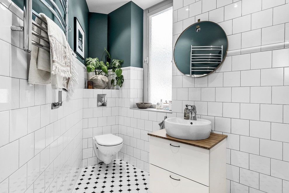 This direction assumes a spacious layout and a lot of free space, but often the Nordic style is used in small rooms in Khrushchev houses. When decorating a small Scandinavian-style bathroom, you can choose a black or gray grout for white tiles.