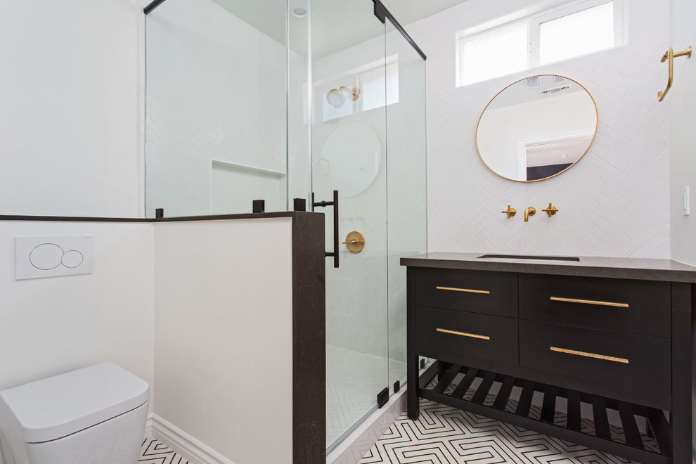 The photo shows a black and white bathroom with contrasting furniture and Scandinavian-style finishes.