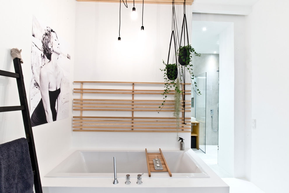The outer side of the shower curtain can be made of linen, satin or cotton with a pleasant texture. Hanging robes and towels should also not stand out from the overall design. The room is complemented by wicker baskets, potted plants and textile containers for clothes: these ideas will help soften the strict Scandinavian style in the interior of the bathroom.