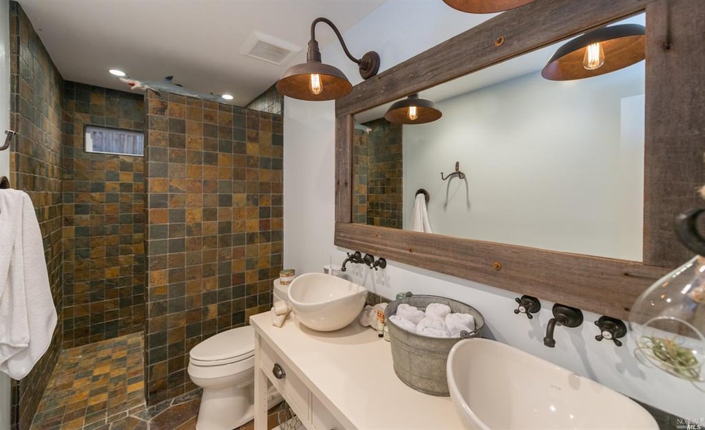 In the design of a country-style bathroom, multifunctionality of furniture is allowed, but preference is given to simple, unambiguous objects: a wardrobe should look like a wardrobe, a chair like a chair. Gloss and shine are undesirable effects, but worn, scratched or even chipped things, on the contrary, will look in their place.