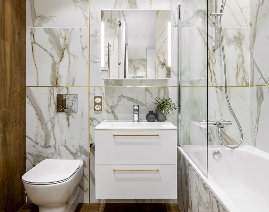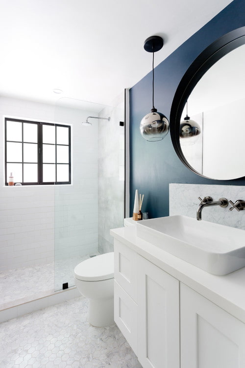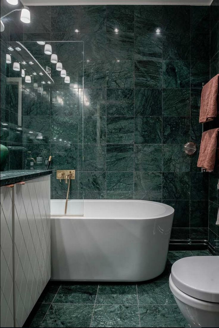 - Scandinavian... Here, the details are made in marble: a sink, a shower tray, an accent wall.